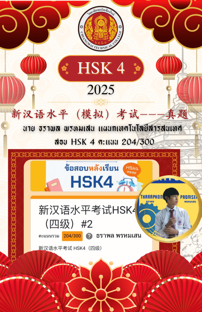 ผลงานการส่งเสริมการศึกษาต่อต่างประเทศฯ นายอาณกร ก้านแก้ว สอบ HSK 2 คะแนน 200/200 เข้าศึกษาต่อ...