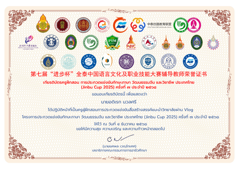 เกียรติบัตรครูฝึกสอน การประกวดแข่งขันทักษะภาษา วัฒนธรรมจีน และวิชาชีพ ประเทศไทย (Jinbu Cup 2025) ครั้งที่ ๗ ประจำปี ๒๕๖๘