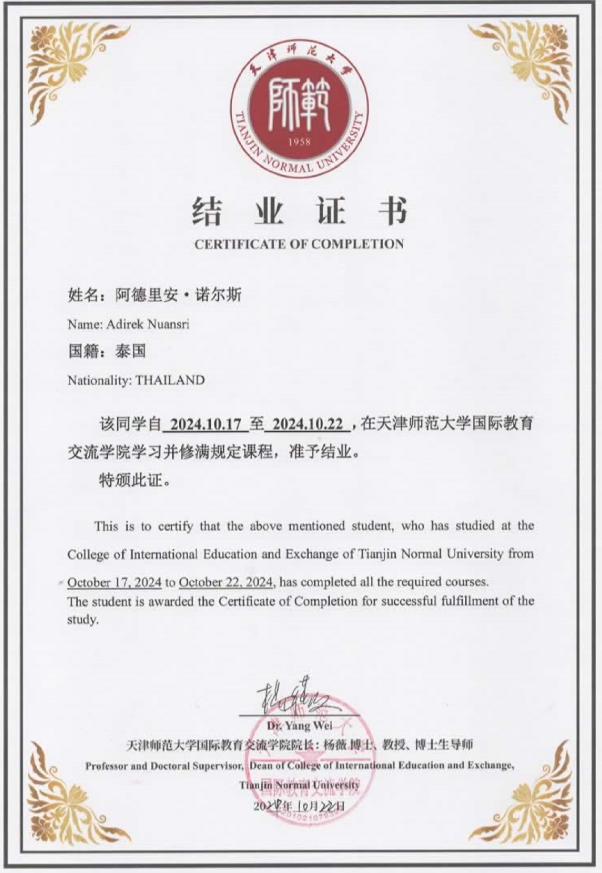 การอบรมหัวข้อ”การพัฒนาศักยภาพการสอนสำหรับครูไทยในโครงการภาษาจีน”(The Enhancing Teaching Competencies for Thai Teachers of Chinese Language Program) สำนักพัฒนาสมรรถนะครูและบุคลากรอาชีวศึกษาสำนักงานคณะกรรมการการอาชีวศึกษา กระทรวงศึกษาธิกาประเทศไทย ประกาศนียบัตรฉบับนี้ให้ไว้เพื่อแสดงว่า นาย อดิเรก นวลศรี เพื่อขอบคุณในการแบ่งปันความรู้และประสบการณ์อันมีคุณค่าในฐานะ วิทยากรรับเชิญ (Guest Speaker)ในการอบรมหัวข้อ “การพัฒนาศักยภาพการสอนสำหรับครูไทยในโครงการภาษาจีน” (The Enhancing Teaching Competencies for Thai Teachers of Chinese Language Program) ให้ไว้ณ วันที่ ๒๙ กันยายน ๒๗๒๔